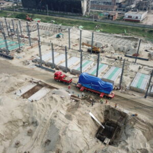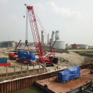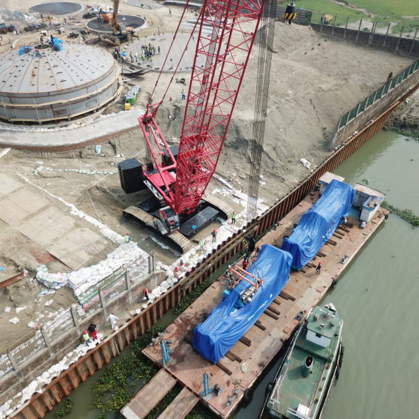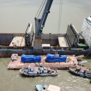 Steady Lift received the Engine (1,191CM x 295CM x 483CM) at the jetty of the Mongla Port weighing 170 CBM. Steady Lift first received and handled the items at the Mongla port. The Engine was first loaded on to a barge and transported ashore. The Engine was then transported to the project site in Ashuganj on 9-axle lines.